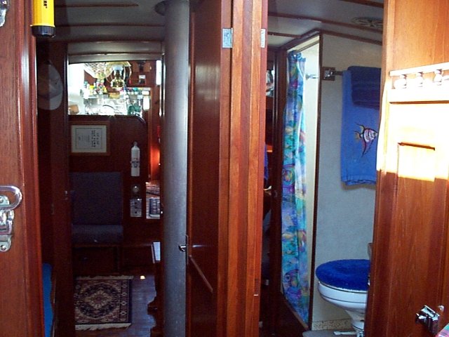 A view of the head (bathroom for you landlubbers) and shower, and the two other forward cabins.