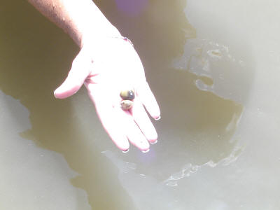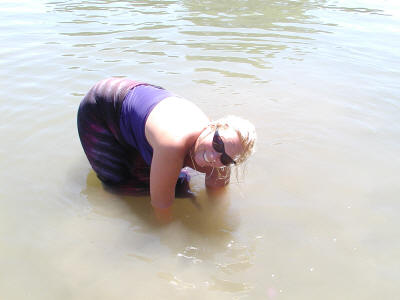 Karen said she felt clams in the water and reached down and found a few.