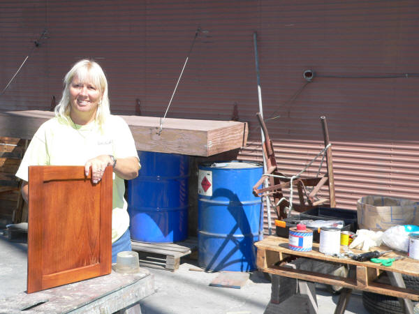 Karen refinishing the doors. She can make all the mess she wants to.