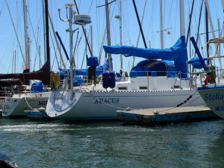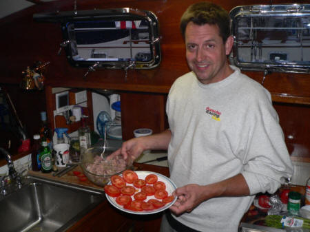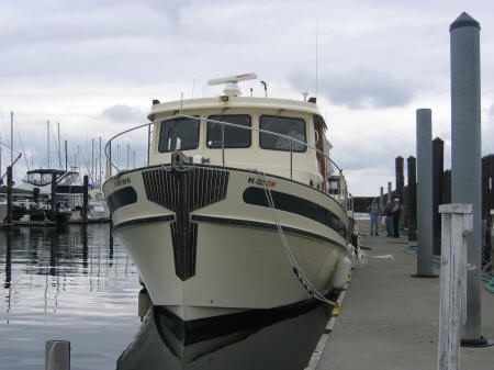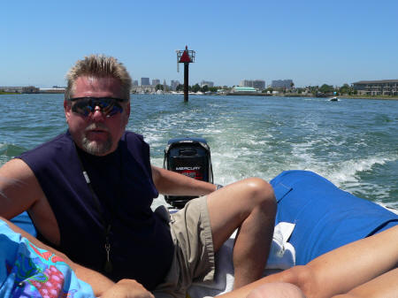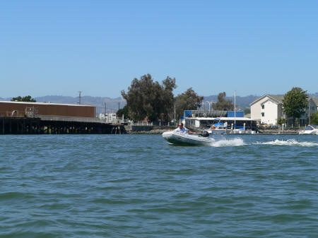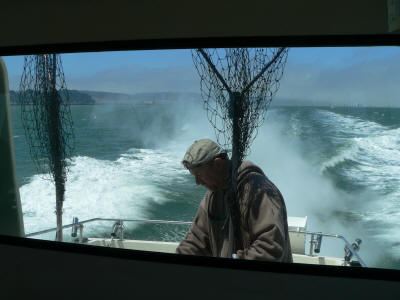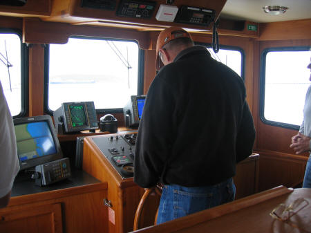 Barry at the helm. Side view heading into the boat yard