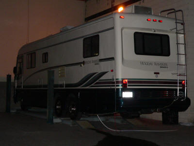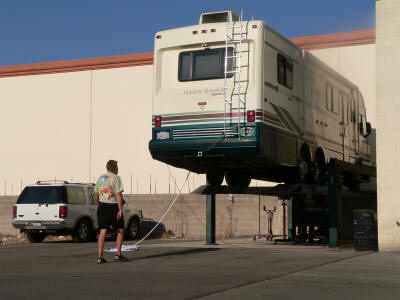The motor home up on the rack by day. Tony the shop owner