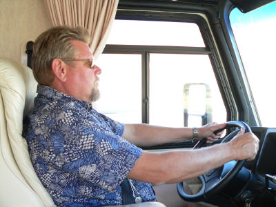 A view out the front of the motor home. Bob and Sheri ready for a ride
