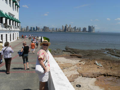 Karen with Panama City behind her. Arriving at the locks on the first day