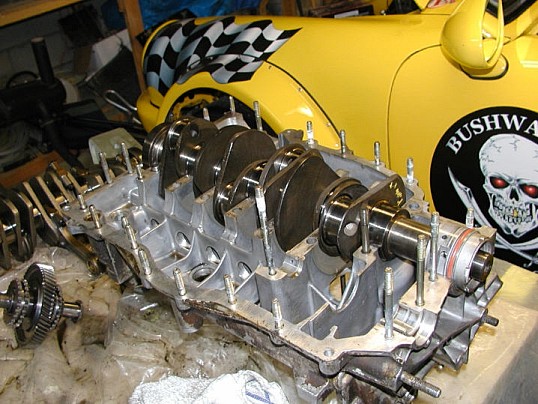 This is what's called an "over square" or "short stroke" design which should safely allow higher revs and a torque curve that is quite wide. The pistons come from a 3.8L RSR motor and the crank & rods are out of a 3.0L motor. You'll notice the 69.4mm stroke on the engine; to achieve this, it is necessary to destroke (or grind down the journals) on a 3.0L crank. Easier said than done, but since Boyds has 5,000 cranks in stock that they've done work on - no big deal. Magaflux it first to check for cracks, grind down 1mm of journal material, then knife-edge it, balance it, and polish it.