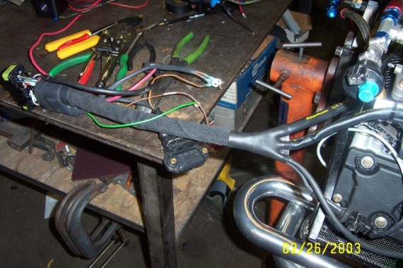 I hand-built the wiring harness from scratch. I called up Raychem, got ahold of a field engineer and had him bring us a huge selection of wiring harness parts. He even gave us a full tutorial on building harnesses. It didnt hurt that he used to consult w/ Formula One on their harnesses so I was using all the same stuff. It even worked the first time we put it on the dyno!