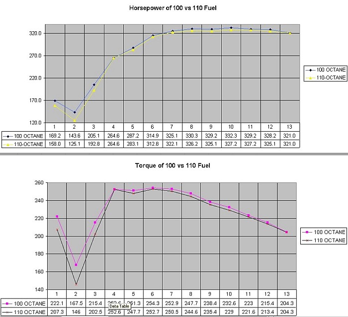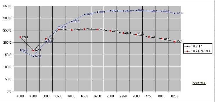 Max HP was 332@ 7500rpm. Max Torque was 252 ft-lbs from 5500-6750. Not bad. The most surprising result was what happened when we switched from 110 Leaded to 100 Unleaded fuel. Some may say it's the octane but after I contacted the fuel companies in search of answers, they assure me that it's the oxygen content in the unleaded gasoline that's responsible for the power gains, not the octane levels. The most noticible difference was in the low power band which is where it was needed most.